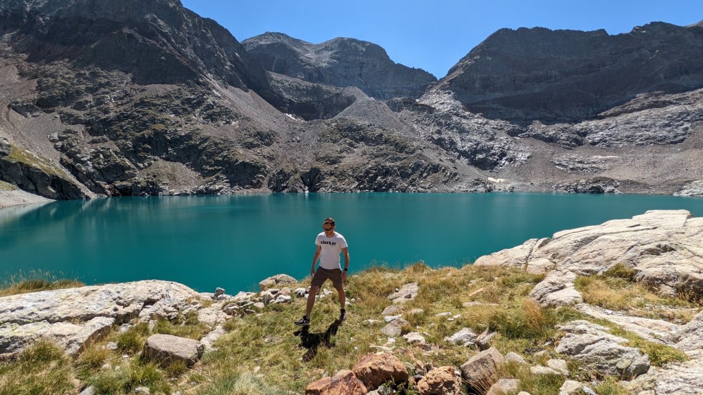 Au loin, je vois le barrage et le refuge. Je me souviens que la traversée du replat est longue mais facile. Impossible de se perdre ici. Je rattrape les numéros deux et trois. Numéro un est en train de grimper la dernière paroi sous le refuge. Je garde le souvenir d’un passage d’escalade un peu compliqué. Mais en 2018, il y avait de la neige et plongé au coeur d’un brouillard épais, je ne voyais rien. Oui, il faut s’aider des mains mais il n’y a finalement pas la moindre difficulté. Je rejoins numéro un en face du refuge. Je tente de repérer la Tusse de Montarqué, mais je ne suis pas sûr de moi. Je fais quelques pas sur le barrage du lac du Portillon. En 2018, j’étais juste venu le voir, faire un selfie sous la pluie. Histoire de. C’était un lac banal à la couleur terne. Aujourd’hui, sous le Soleil, le lac du Portillon est d’un bleu turquoise somptueux.