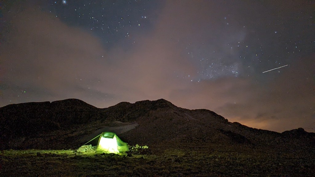 Si les nuages se sont dissipés, c’est certainement parce que le vent vient d’arriver sur la Tusse. Rien de méchant pour l’instant mais je vais avoir du mal à m’endormir. Je tourne en rond. Je suis attentif au moindre bruit. Des chutes de roches vers le Portillon et un orage lointain dont le bruit se déplace tout le long de la vallée. Ces sons fascinants font prendre conscience de la petitesse de l’être humain. Nous ne sommes rien face à la Montagne. Il est minuit. J’ai envie de pisser. Je sors de la tente. Je suis en boxer. Il fait trop froid. Je me remets dans mon sac de couchage. J’ai toujours envie de pisser. Si j’ouvre le sac de couchage par le bas, je pourrai m’en servir comme d’une robe afin de libérer mes jambes. Je fais ça et je quitte de nouveau la tente. Les nuages ont disparu et le ciel est magnifique. C’est toujours un spectacle magnifique que d’observer la voie lactée dans les Pyrénées. Il faut impérativement que je profite de cette occasion unique pour tester le mode astrophotographie de mon Google Pixel 6 pro.