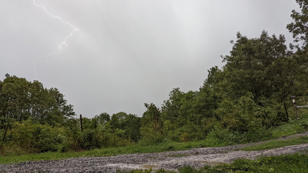 Quelques gouttes commencent à tomber. Je prends ma carte et mon bouquin pour me réfugier à l’intérieur. Pito reste sur sa chaise. Alors que je suis en train de sceller ma décision et de fixer le pic Gourdon comme objectif, le conjoint d’Estelle apparaît dans le séjour avec un grand sourire. Nous nous présentons et nous installons tous les trois autour de la grande table. Dehors, une grosse averse tombe. L’orage commence à gronder. J’ai peu de souvenirs d’orages dans les Pyrénées mais ce sont toujours des orages spectaculaires. Je sors, la vapote à la main pour tenter de photographier un éclair. Ça fait des années que je n’ai pas eu l’occasion de prendre un éclair en photo. Face aux rangs de framboisiers, je me délecte de ce spectacle. Mais j’ai pris la bonne décision en venant ici. Une fois l’averse et l’orage terminés, j’annonce à Estelle et son conjoint que je pars manger sur Peyragudes. Je réitère que s’ils souhaitent m’accompagner, ce sera avec plaisir. Il me faut de longues minutes avant de retrouver le nom de La Terrasse et Estelle se propose de nous y conduire.