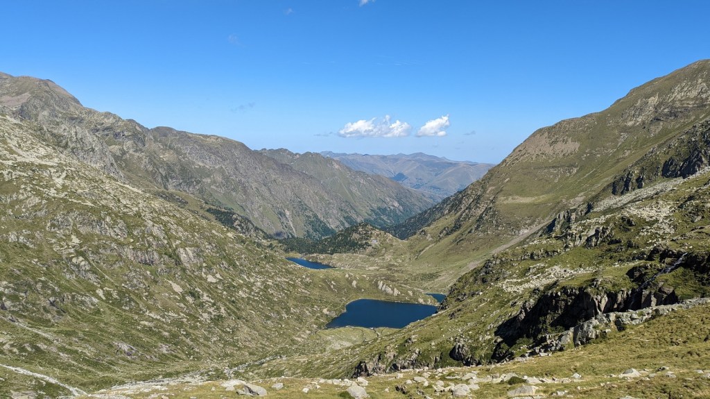 J’ai un léger haut le cœur en reconnaissant ce passage. Mais c’était il y a quatre ans. Il pleuvait. Aujourd’hui, même si je ne suis pas en confiance, je ne ressens pas d’appréhension. C’est surtout le poids du sac qui peut m’entraîner en bas au moindre faux pas. Je réfléchis tout de même un instant avant de me lancer et je continue ma route. Ce passage en particulier m’avait tellement marqué que j’en avais oublié que d’autres n’étaient pas plus évidents. A la sortie d’un lacet, je repère des cairns qui mènent tout droit. C’est ceux que j’avais suivis en 2018, sans me rendre compte que je quittais le sentier. Je ne me ferai pas avoir une seconde fois. Aujourd’hui, il me parait évident que d’autres s’y sont perdus. J’envisage un instant d’attendre les filles afin d’être sûr qu’elles ne fassent pas la même erreur, mais elle me voient marcher au dessus d’elles, elles ne pourront pas se perdre.