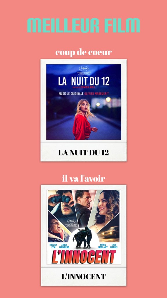 Mais le vrai candidat qui va s’opposer à L’Innocent pour l’attribution du César du meilleur film, c’est La Nuit du 12 de Dominik Moll. Mon favori. Le film devance L’Innocent sur de nombreux aspects techniques comme, la photographie, les décors, le montage et le son. C’est le scénario très inventif de L’Innocent qui devance d’une courte tête La nuit du 12.