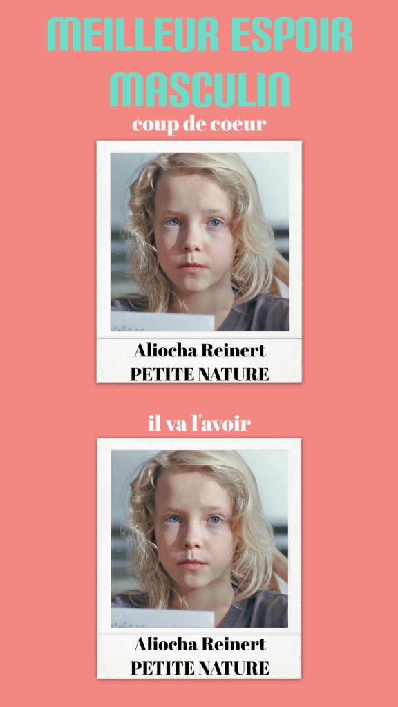 Aliocha Reinert dans Petite nature. On ne peut pas rester insensible au jeu exceptionnel du jeune garçon qui à seulement 11ans, livre une prestation absolument incroyable. C’en est totalement incompréhensible, d’autant que le rôle de Johnny, jeune banlieusard en quête de repères, qui tombe amoureux de son instituteur, est un rôle extrêmement complexe. Vous l’aurez compris, c’est également mon coup de cœur. Mais face à l’impeccable Bastien Bouillon dans La nuit du 12, la partie n’est pas jouée.