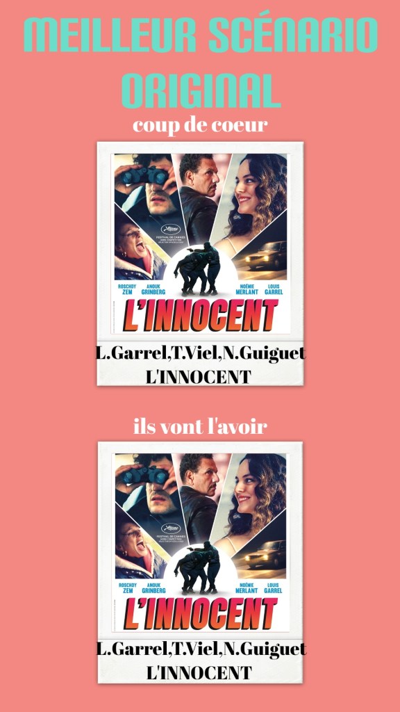 Louis Garrel, Tanguy Viel et Naïla Guiguet pour L’Innocent. C’est également mon coup de coeur. Ce casse familial, est hilarant, émouvant et formidable d’inventivité. Le choix reste difficile quand on sait que l’Innocent est opposé au dynamique et efficace A plein temps, au fabuleux Saint Omer, à l’émouvant Les Amandiers et à En corps, qui n’a que peu retenu mon attention.