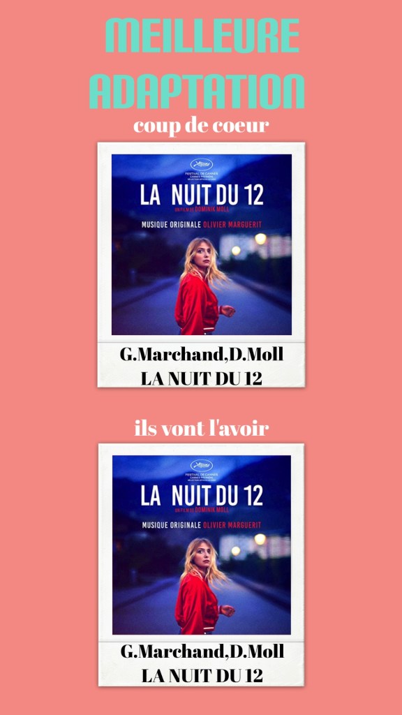 Gilles Marchand et Dominik Moll pour La nuit du 12. Il me semble que pour remettre le César dans cette catégorie, il faudrait avoir lu Une année à la PJ de Pauline Guéna (La nuit du 12), L’Infiltré d’Hubert Avoine et Emmanuel Fansten (Enquête sur un scandale d’État) et vu Ne coupez pas ! de Shin’ichirō Ueda (Coupez !). Evidemment, ce n’est pas mon cas, je suis donc parti sur la base du meilleur scénario entre les trois films nommés et je ne vous cache pas que mon coeur balance entre le fabuleux Coupez ! De Hazanavicius et La nuit du 12 de Moll. Le dernier retient encore une fois mon attention.