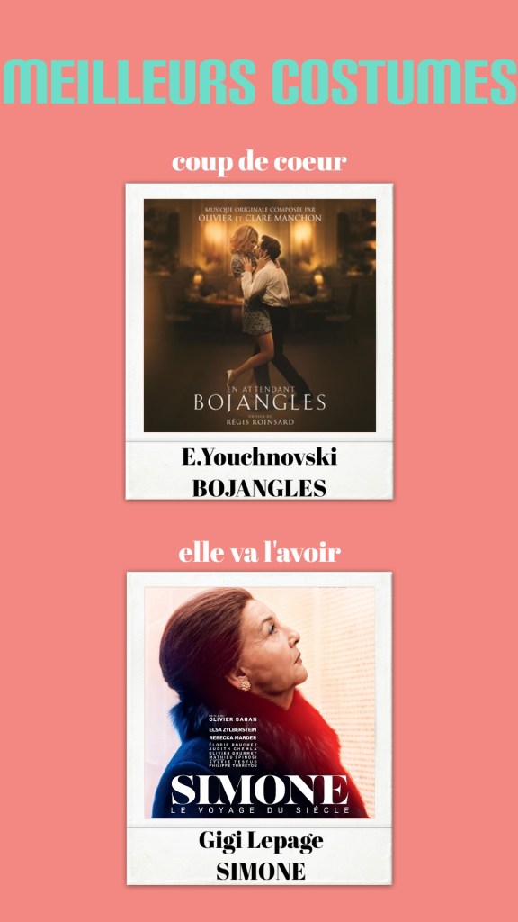 Gigi Lepage pour Simone, le Voyage du Siècle. Le film signé Olivier Dahan, pourrait bien repartir de cette cérémonie avec une récompense. Simone est l’une des grosses polémiques des César. Nommé uniquement pour les décors et les costumes, l’annonce des nominations a suscité beaucoup d’émoi sur les réseaux sociaux. Notamment avec l’absence d’Elsa Zylberstein dans la catégorie meilleure actrice.