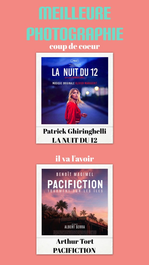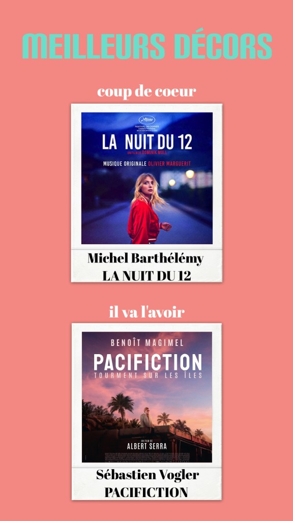 C’est la photographie qui sublime ou non les décors, et comme pour la catégorie précédente, je pense que le César ira à Artur Tort pour Pacifiction. En revanche, La nuit du 12 est ma grosse claque visuelle de cette 48ème cérémonie des César. Le chef op Patrick Ghiringhelli a fait un travail fabuleux sur les couleurs et les éclairages, offrant au film une atmosphère très singulière. Les séquences de nuit sont particulièrement sublimes.