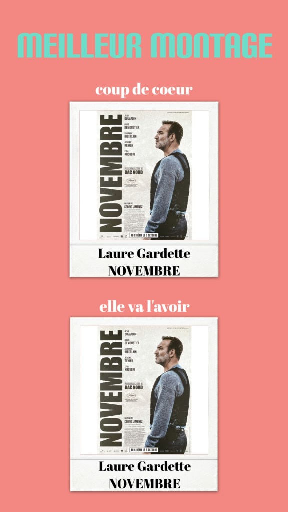 Laure Gardette pour Novembre. C’est aussi mon coup de coeur. C’est rythmé, agressif, des temps de pause moins ciselés nous permettent de reprendre notre respiration. L’étalonnage est parfait et c’est ce que je reproche essentiellement à L’innocent, nommé dans la même catégorie. La saturation me paraît excessive. Je me suis demandé si mon blu-ray n’avait pas un défaut (ce que j’envisage toujours).