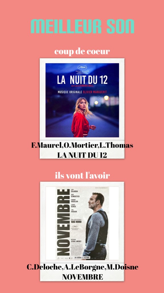 Je précise que j’ai écouté tous les films au casque. Et dans Novembre, on ne peut pas passer à côté des effets sonores. L’immersion est totale et je n’ai aucun doute sur le fait que la récompense ira entre les mains de Cédric Deloche, Alexis Place Gwennolé Le Borgne et Marc Doisne. En revanche, je l’ai trouvé trop agressif pour ma part et j’ai eu un vrai coup de cœur pour les effets sonores de La nuit du 12. L’expérience est tout autant immersive et plus agréable.