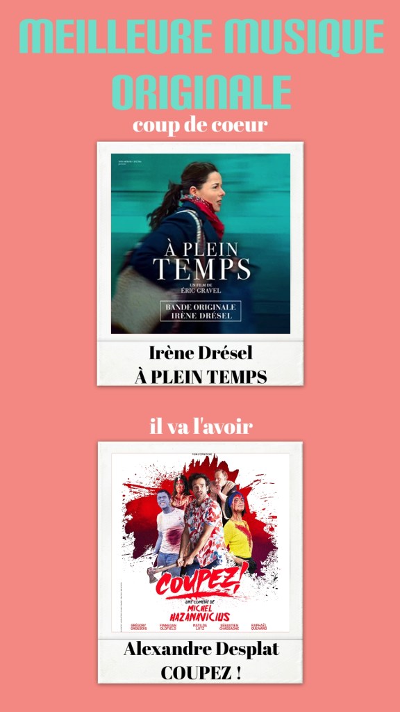 Mon coup de cœur : Irène Drésel pour A plein temps. Irène Drésel a fait un travail fabuleux en composant une bande originale qui colle parfaitement à la dynamique du film. Le personnage, merveilleusement interprété par Laure Calamy est dans l’urgence du début à la fin du long métrage. On ne peut pas ne pas remarquer la musique qui renforce systématiquement ce sentiment d’urgence. Cependant, Irène Drésel n’obtiendra pas le trophée car la mélodie et la tonalité globales sont toujours similaires. On approche d’une certaine monotonie musicale.