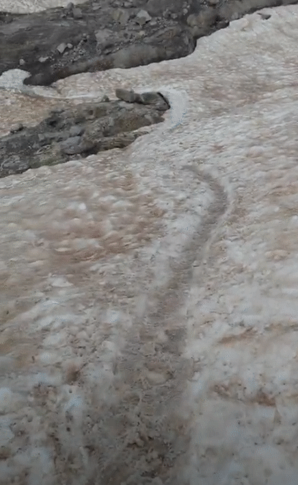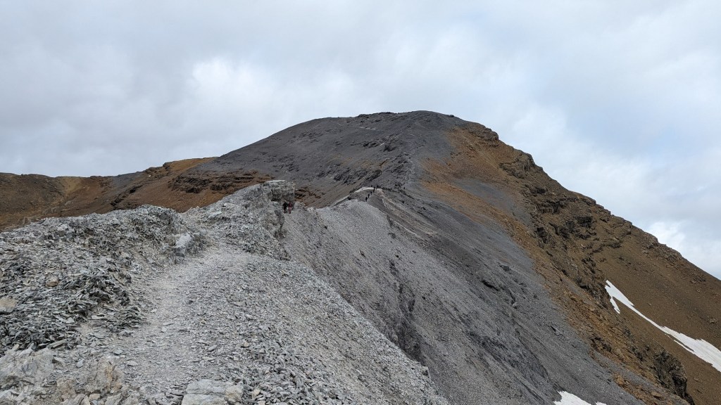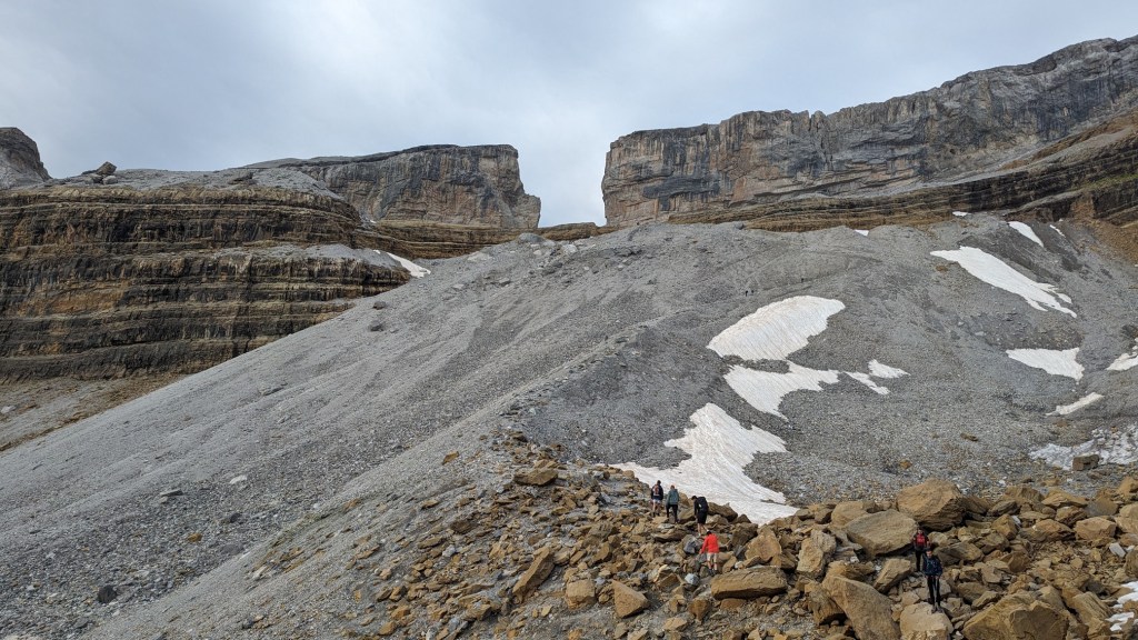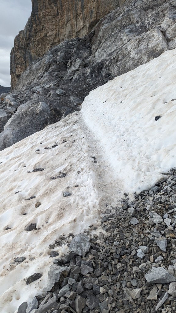 Aucun des récits que j’ai lus ne mentionnait la traversée d’un glacier en dessous de la Brèche. Ou peut être que si, peu importe. Je sais que la neige, ça m’angoisse un peu… C’est un terrain où il est tellement facile de perdre la stabilité. Ici, ça va, c’est sans danger. Les nombreux randonneurs, lors de leurs passages, on fait une trace bien marquée. Le glacier est au cœur d’un vaste replat. J’enfonce mes pieds dans la neige et ne glisse à aucun moment. Aucun danger, aucun vertige. Pour l’instant…
