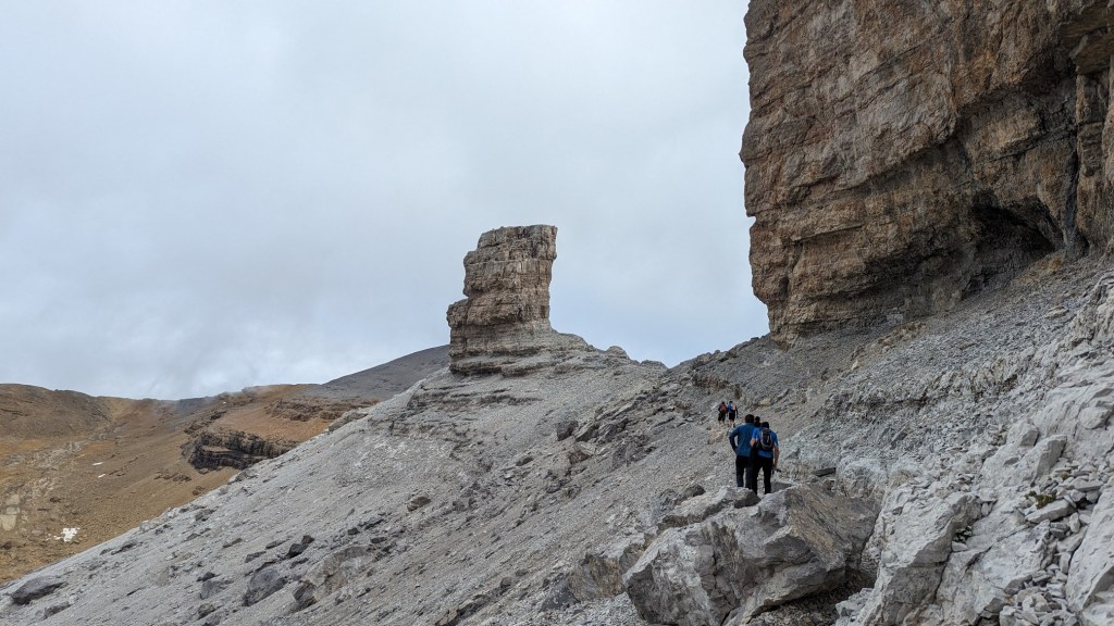 Alors, à l’instant où j’écris ces mots, je rêve toujours de franchir le Pas des Isards, mais maintenant que je l’ai vu de mes yeux, je n’en fais plus une priorité absolue. Le Casque du Marboré ne sera pas mon prochain 3000. Une chose est sûre, il ne faudra pas que je sois seul. Il y a beaucoup de monde sur la Brèche et je profite de voir un groupe de quatre personnes partir vers le Taillon, pour les suivre. On continue donc à droite de la Brèche en longeant le flanc de la montagne. A présent que mon vertige a été mis en éveil, l’exposition est plus compliquée. Mais heureusement, le chemin est facile. De gros rochers stables me permettent de faire un break. Je commence à avoir la tête qui tourne et je réalise que je n’ai toujours pas bu la moindre goutte d’eau, ni mangé. Ca fait plus de deux heures que je suis parti du col des Tentes et je n’ai ni faim ni soif. Je bois quelques gorgées et me force à manger trois pâtes de fruits. Bon et une quatrième parce que c’est bon. Je reprends la marche et ne tarde pas à voir enfin le Doigt de Dieu. J’en ai tant rêvé et cauchemardé ces derniers jours que cette rencontre était devenue indispensable.