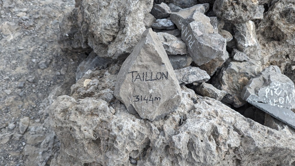 Des nuages bloquent la vue, il fait très, très froid mais c’est une ascension réussie. En revanche, je ne pensais pas qu’elle serait aussi traumatisante. Je me sens à l’aise au sommet parce que c’est un sommet vaste et mon premier réflexe est d’aller repérer les pics de Gabietous. Je pourrais me trouver beaucoup d’excuses. Oui j’ai mal à tête, oui ça fait quelques jours que mon adducteur droit me fait la misère, oui à cause du vertige j’ai beaucoup fléchi les jambes et j’ai mal aux genoux, mais la vérité, c’est que je n’ai pas le courage de prolonger mon ascension. Il n’est que 11 heures, j’ai le temps mais je flippe. Baptiste parcourt le Taillon en large et en travers, moi je ne bouge plus.