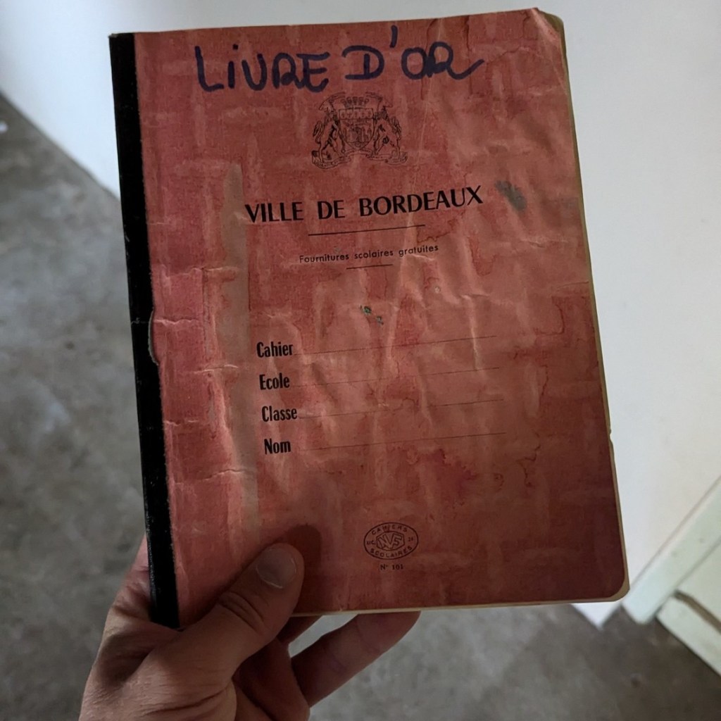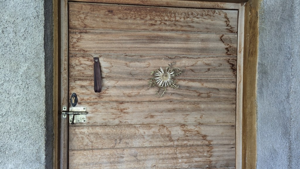 J’ai dit chemin ? Oui oui, nous sommes sauvés. A partir de maintenant, nous allons randonner. Après avoir vidé nos chaussures, nous discutons avec Elisabeth. C’est amusant, elle vient de Montory et est une amie de Magali qui m’a reçu dans son gîte Etché Arguinia après mon ascension du pic d’Anie. Elle est également inscrite dans un club de course à pied. Des traileurs surtout. L’évocation des Rapetou, qui sont souvent présents dans les trails pyrénéens, lui est familière. Daniel ramasse un chardon, accroché au dessus de la porte, ça porte chance. Je ne capte pas encore ce qu’il dit, nous arrivons au lac de Lhurs et je tente désespérément de faire remonter des souvenirs. Nous sommes devant le cayolar de Pouey, au dessus du lac. Je n’ai aucun souvenir d’une deuxième cabane. Accroché à la porte, un chardon fait écho au discours de Daniel et me remmène à la raison. Nous descendons au cayolar de Claveranne. Détruit, il a entièrement été reconstruit. Anciennement rudimentaire, la cabane a été transformée. Propre, avec mezzanine, elle semble à présent très confortable. Sur l’escalier, Daniel trouve un vieux cahier d’école. Un livre d’or, avec l’inscription « ville de Bordeaux », un signe dont je cherche encore le sens…