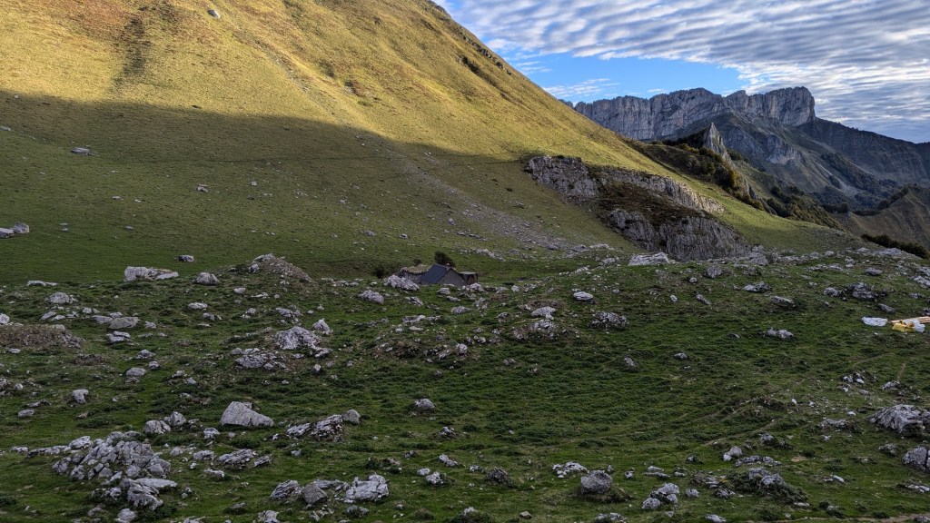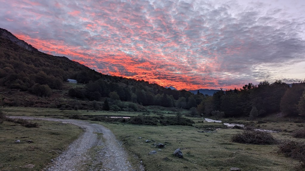 Mon réveil sonne à 4h. Ca fait déjà 20 minutes que je suis sur mon téléphone. J’ai dormi pas loin de 8h. Mes jambes sont lourdes mais ça peut le faire. Douche express et direction Lescun. J’arrive sur le parking d’Anapia à 7h30. Une voiture de gendarmerie est sur le parking, phares allumés. Je prends mon sac et démarre ma randonnée alors que les premières lueurs du jour font leur apparition. Je suis suivi par deux personnes qui avancent avec une lampe frontale. Alors que je me dirige vers le plateau de Sanchèse, quatre voitures de gendarmerie passent à côté de moi. Merde, quelqu’un a disparu, ils vont lancer les recherches au lever du jour. L’idée me glace et me rappelle la mort du randonneur sur les Spijeoles, la veille de mon ascension ratée du pic. J’arrive sur le plateau de Sanchèse, le Soleil s’élève et le ciel semble s’embraser.
