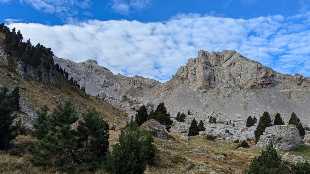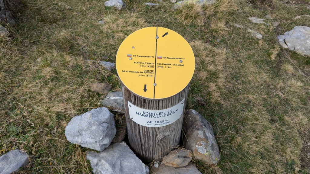 J’arrive aux sources de Marmitou. De tous les côtés, de nombreux petits ruisseaux dévalent la pente. A partir d’ici, je ne suivrai plus la trace du GRT13. Je repère le rocher identifié par une croix blanche et rouge, la suite se fera en suivant les cairns. Je prends une nouvelle pause, au beau milieu du cirque d’Anaye, je suis sans voix. Le décor est absolument superbe. C’est simple, je n’ai pas le souvenir d’avoir déjà vu un paysage aussi beau. Une vaste pelouse jaunissante, occupée par des rochers et des sapins. L’ensemble est dispersé avec une perfection étonnante. Je viens de faire un pas sur la Lune. Spectaculaire. Mon ascension pourrait s’arrêter ici, oui je pourrais passer ma journée dans ce cirque et être l’homme le plus heureux du monde. Mais mon livre est resté dans la voiture. C’est à contrecœur que je quitte les sources pour m’élever en direction du col des Ourtets.