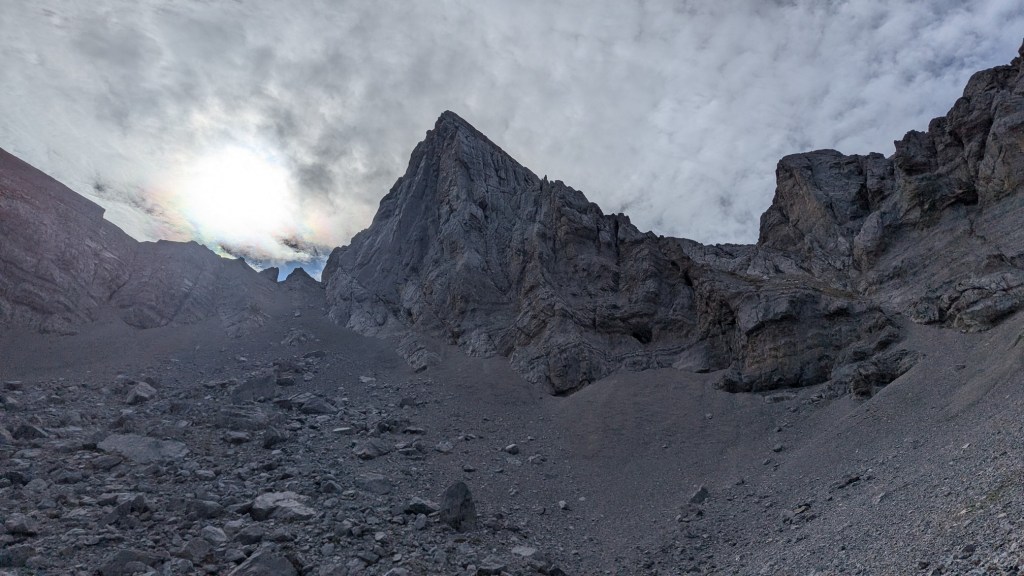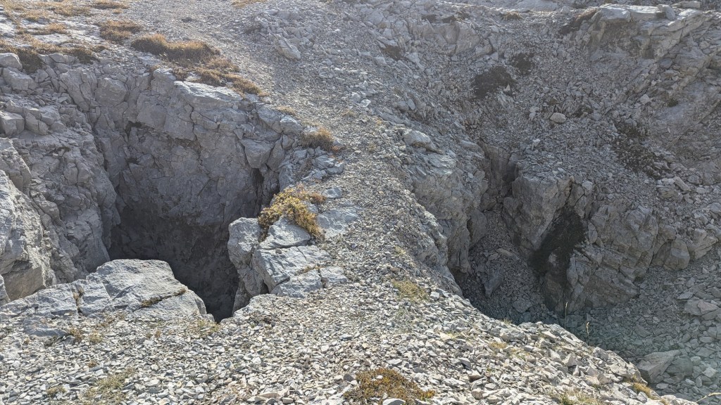 Après plusieurs minutes d’ascension vers le col, je réalise que je suis seul au monde. Plus personne ne me suis. Si j’ai appris par cœur comment rejoindre le col depuis le parking, la suite était imprécise dans les vidéos et topos vus et lus. Mon arrivée au col se fait sans encombre mais je suis loin d’imaginer les difficultés à venir. Un premier passage annonce la couleur. Un pont de pierre suspendu entre deux trous béants. Si le passage ne présente aucune difficulté, ma peur vient de se réveiller. C’est trop tôt, mais elle est bien là. Je comprends que je vais être dans l’inconfort pour le reste de la journée. Pourtant, je passe facilement. Je lève les yeux et repère des cairns sur ma gauche. Mais merde, il y en a en face et aussi à droite. C’est totalement stupide et incompréhensible. Je comprends également, dans cet immense désert, qu’il sera très facile de se perdre. Je regarde, je prends des photos. Si ça peut m’aider pour le retour… Ici pas de réseau, impossible de consulter la carte.