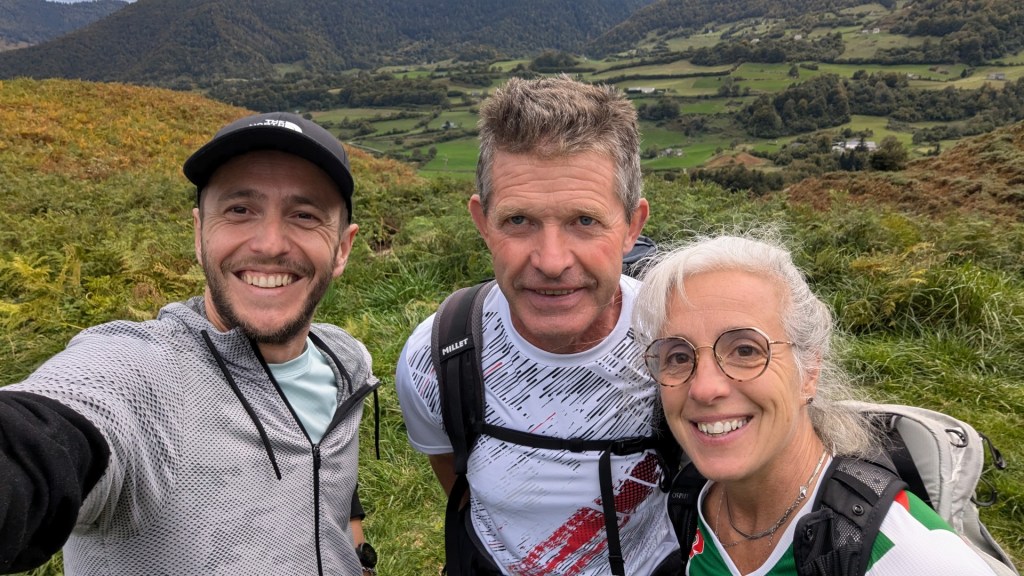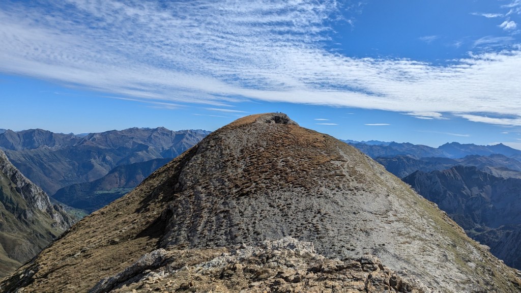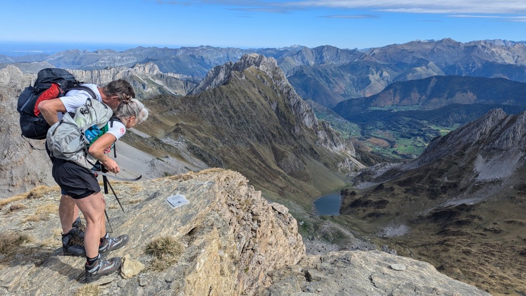Alors que je regarde en direction du pic des Trois Rois, je vois Daniel et Elisabeth qui attaquent la désescalade. C’est incroyable, je n’ai jamais vu ça. Le moindre geste, le moindre pas d’Elisabeth, elle anticipe tout, elle s’assied sur les rochers, elle pose ses mains partout, elle est train de descendre exactement comme moi je le ferais. Elle a vraiment le vertige. Daniel lui, descend comme on descend un escalier, sans la moindre crainte. Il tient Elisabeth à chaque moment délicat. Je comprends alors que nous avons les mêmes difficultés et je me sens tout à coup rassuré de savoir que je ne suis pas le seul atteint de vertige à vouloir aller sur les sommets. Si je les avais suivis, j’aurais peut-être pu y arriver. Mais ça aurait fait tâche dans ma conclusion. Quoiqu’il en soit, je sais aujourd’hui que je ne reviendrai pas. Je n’irai pas plus haut que le cirque d’Anaye ou le lac de Lhurs. Je retrouve mon couple de sauveurs sur le col. Je les félicite. Direction la Table que je découvre pour la deuxième fois avec la même intensité. Daniel peut citer tous les pics. Moi je n’ai reconnu que le pic d’Anie. Parce que oui, je vois aussi le moi du 17 septembre au sommet du pic d’Anie. Elisabeth quant à elle, discute dans la langue basque avec un randonneur. Clairement, je n’aurais pas pu tomber mieux.