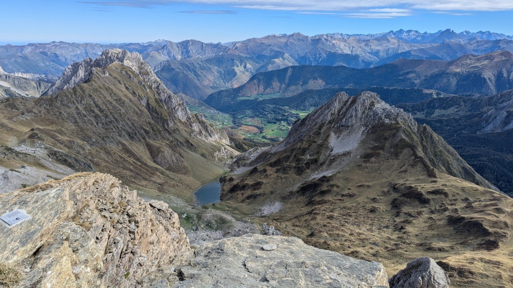 Sur la Table, en direction du lac de Lhurs, il y a un rocher vertigineux qui déborde. Une plaque gravée dessus. Miren Amuriza a chuté mortellement en 2013. Qu’il est important de garder cette notion de danger en montagne. Je retrouve mes esprits rapidement après ça. Direction le pic pour clore cette journée en beauté. Et comme c’est à côté, si j’ai du temps, je reviendrai sur la Table. J’arrive au pied du pic et je rencontre la jeune femme au sac rouge que j’ai suivie avant mon escalade. Elle me conseille de contourner le pic par la gauche. Quant à elle, elle va redescendre vers le lac d’Ansabère sans passer par la Table. Quelques centimètres à flanc de montagne. C’est la largeur de la sente. Sur ma droite, la paroi verticale du pic, sur ma gauche, le vide. La largeur de deux pieds. Je fais 5 mètres. C’est 5 mètres de trop qui ont laissé la peur reprendre toute sa place. Je suis venu pour la Table et je viens de vivre une émotion si forte, qu’il est vraiment temps de s’arrêter là. J’ai fermé cette boucle, le point final est parfait.