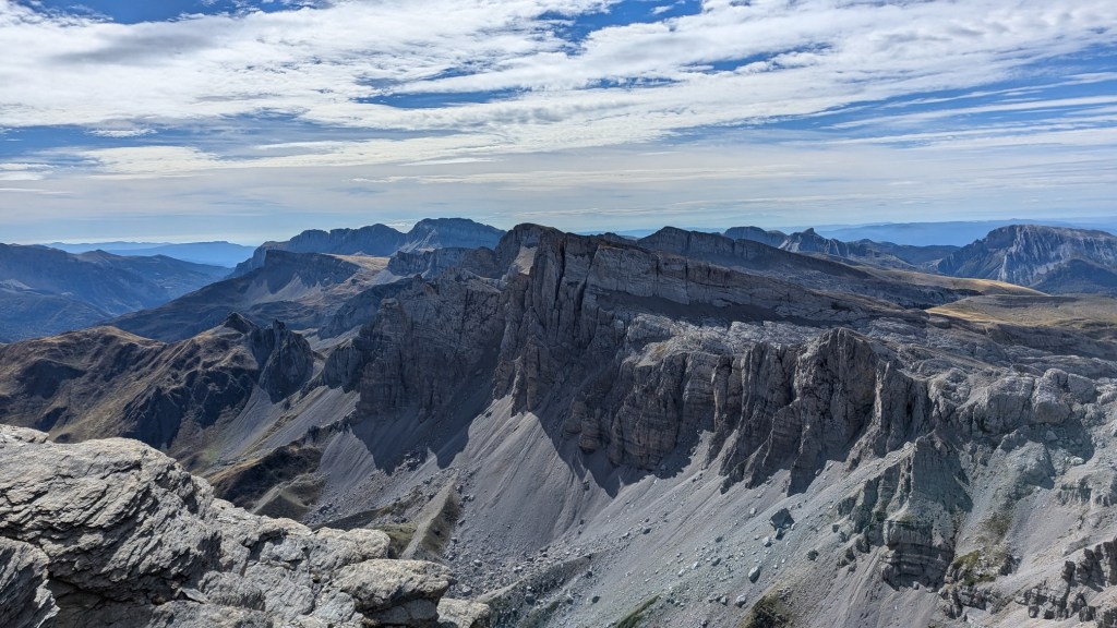 Évidement qu’elle va au pic des Trois Rois. Je vais la suivre. Je m’élance sans réfléchir et, l’espace d’un instant, j’oublie qu’il était question d’arrêter. Elle monte vite entre les rochers. Mon cœur bat toujours la chamade et ma peur m’empêche de suivre la cadence. Après quelques minutes je l’aperçois sur une… falaise. Enfin, pas vraiment une falaise, la roche n’est pas verticale, mais pour moi, c’est tout comme. Je vois qu’elle n’est pas sereine. Clairement, seul, JAMAIS je ne monte ça. Mais quand je dis « jamais », c’est jamais. Dos au vide, dans un climat de peur, avec un gros sac comme le mien, avec un esprit lucide, je pense que je meurs. Vraiment. Mais comme elle est en train de le faire, je ne prends pas le temps de réfléchir. Pourtant, j’ai le vertige, je ne peux pas me retrouver sur une paroi exposée. Je me connais, c’est un coup à se retrouver bloqué.