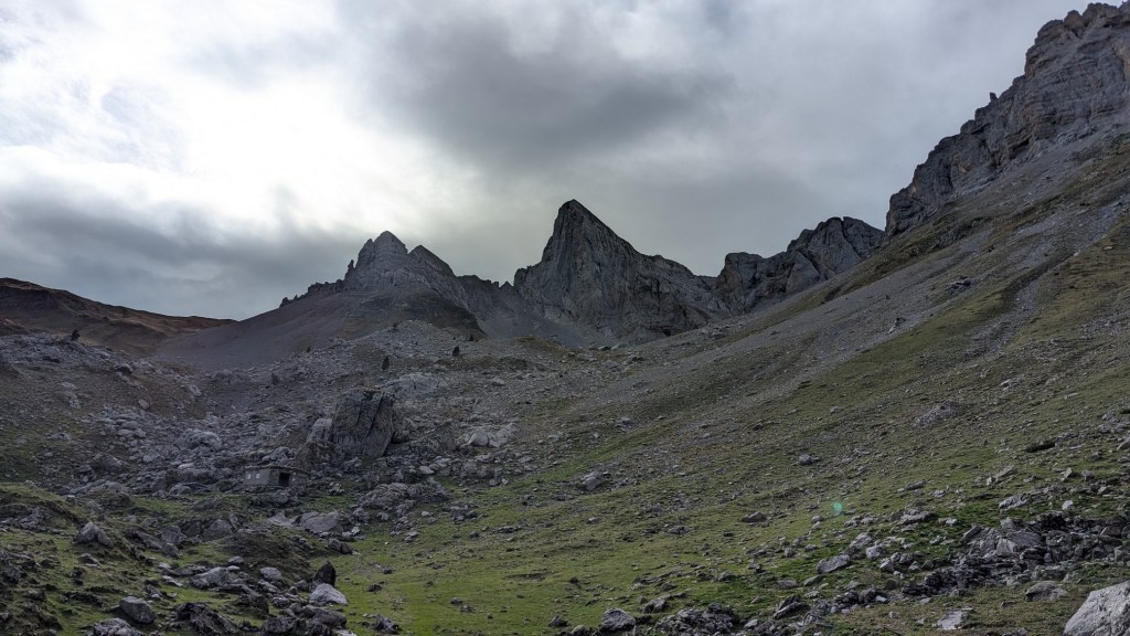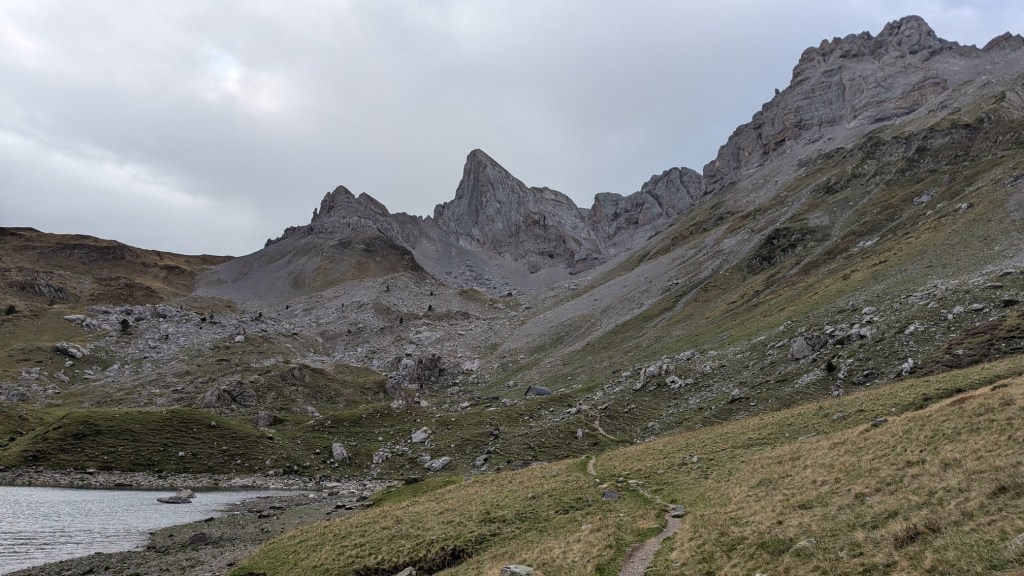 Alors qu’ils sont en pleine ascension, moi je suis en pleine réflexion. Evidemment que passer par le lac de Lhurs aurait été parfait. Je l’avais imaginé mais pour deux raisons, c’était carrément pas envisageable. Déjà, j’ai l’image en tête. Raisonnablement, quand tu regardes la Table des Trois Rois depuis le lac, tu ne vois que des parois verticales autour. Le terme d' »infranchissable » n’est pas sorti de ma casquette. Tu as la vue, jamais t’y vas. Et c’est confirmé par Mariano dans le topo que j’ai étudié avant de partir. « Col de Lhurs (2300m). C’est ici que les randonneurs montent par le fameux couloir très raide depuis le lac de Lhurs. » Avec l’habitude, je sais que si Mariano écrit « très raide », je ne me pose pas de question, c’est pas pour moi. Point. Mais possible pour certains. L’idée de redescendre à la verticale me trouble et à présent, j’ai peur aussi de ralentir le couple de locaux qui a peut-être mieux à faire que de m’attendre.