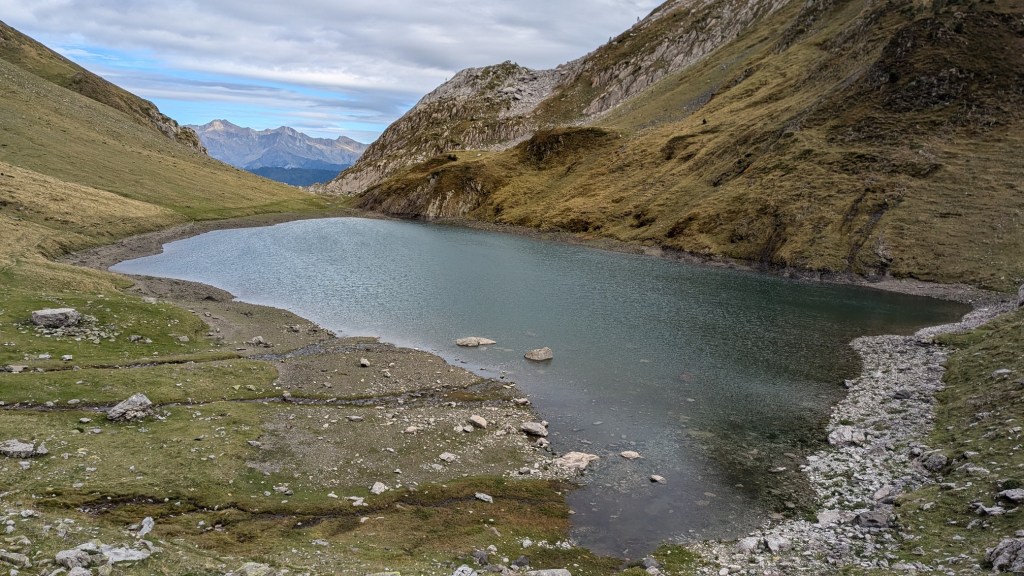 Il est temps de reprendre. Nous finissons la désescalade de l’escalier de rochers, difficilement pour moi, avant de découvrir la vision d’horreur. Voilà pourquoi je n’aurais jamais pris cet itinéraire. Ici, des graviers jusqu’en bas. Et la pente est… très raide. Daniel s’élance, il glisse comme un skieur, et entraîne des petites avalanches de cailloux. Rien que le bruit des cailloux qui roulent me tétanise. Elisabeth quant à elle, choisit de regagner la paroi à droite et de descendre en se tenant aux rochers. Je ne sais pas quoi faire. L’assurance de Daniel me donne envie d’y aller tout schuss. Après tout, la pente est vertigineuse mais je risque quoi ? De tomber ? Mais je vais pas tomber dans le vide, au pire je vais glisser, entraîner les cailloux avec moi et faire de la luge. Je mets les pieds dans les graviers, je glisse, tombe sur le cul et déclenche une petite avalanche de cailloux. A vrai dire, si c’est terrifiant, c’est aussi terriblement amusant. Avalanche sur avalanche, nous tombons sans cesse et rions à chaque fois. Et le rire, c’est bien pour apaiser la peur. On peut pas se faire mal dans ce décor pourtant impressionnant. Seul, aucun doute que je n’aurais pas ri ni même souri. Au contraire, cette descente aurait provoqué de vives tensions. Et alors que nous surfons sur les pierres, nous finissons par atteindre le chemin du lac de Lhurs les chaussures pleines de cailloux.