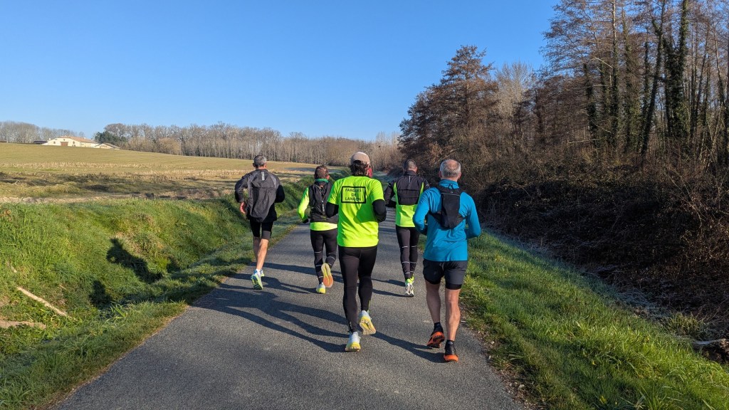 Me concernant, après une fin d’année 2024 et un début d’année 2025 compliqués, il semble, qu’entre le sommeil et l’alimentation, je sois en train de retrouver un certain équilibre. Hallelujah. J’oscille entre quatre et cinq sorties par semaine. Pour ce qui est de mes entraînements solos, j’opte systématiquement pour des côtes autour de chez moi. Les côtes. Raaah ces satanés merdasses de côtes… En 2020, je ne savais même pas ce que c’était de courir sur une côte. En même temps, je n’y voyais aucun intérêt… Pendant la course, je m’étais carrément arrêté pour faire une pause à la sortie de Cazats. En 2022, ayant complètement zappé cette histoire de côtes, je m’étais arrêté avant de passer sous le pont de l’autoroute, avant Coimères. Jamais deux sans trois quand on est idiot, si je ne m’étais pas arrêté en 2023, j’en avais chié comme pas possible mais avais pu compter sur le soutien de Serge tout au long de la course.