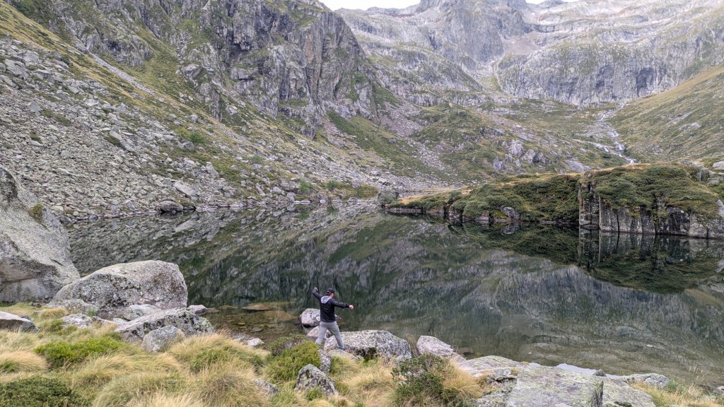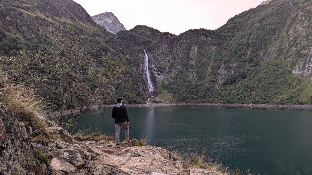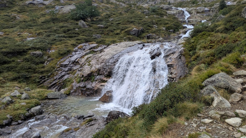 Si on efface ma descente du parcours sous l’orage en 2022, je n’ai jamais vu autant d’eau ruisseler sur le chemin. Les trois semaines de pluie ont rempli les lacs qui se déversent petit à petit dans la vallée. Il fait froid, l’eau s’infiltre dans ma chaussure gauche alors que je traverse une cascade. J’ai le pied trempé.