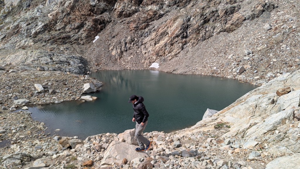J’avais oublié qu’il fallait autant s’aider de ses mains pour monter jusqu’au pierrier en contrebas du col du lac. Sans parler de vertige, mon inconfort et ma prudence excessive me ralentissent de façon considérable. J’ai toujours ce besoin d’assurer mes pieds et mes mains, de bien ressentir la solidité du sol avant de m’élancer. C’est comme ça aussi que je me fatigue plus rapidement et que les douleurs musculaires apparaissent.