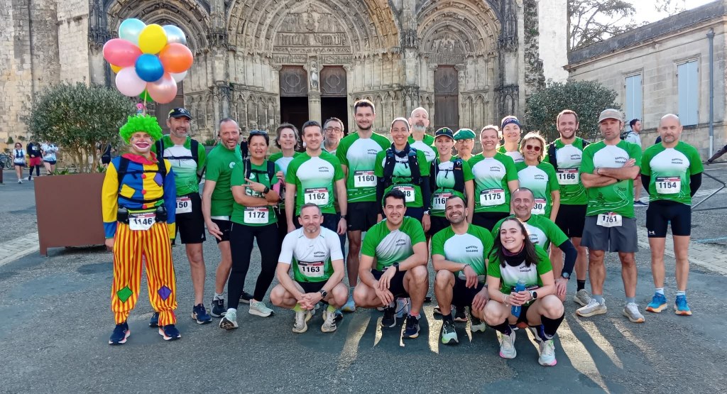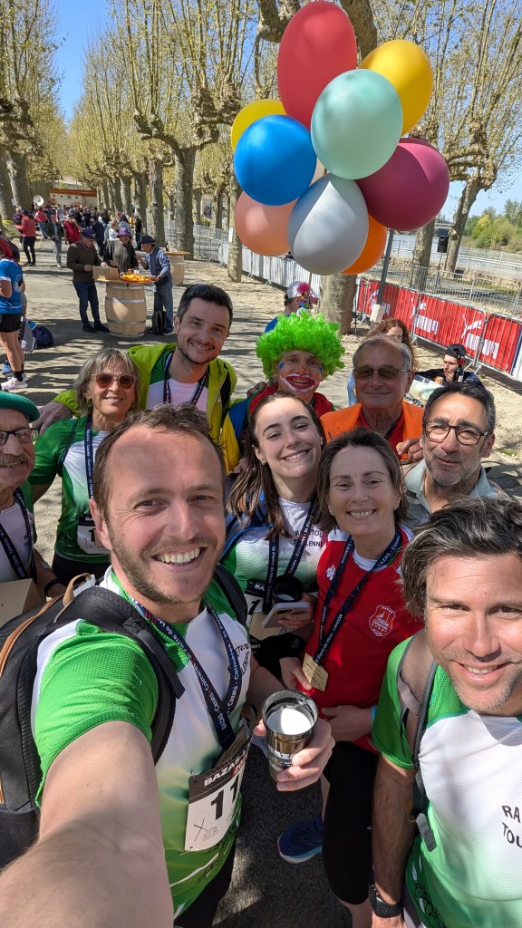 On s’échauffe avant d’arriver sur la ligne de départ. Je retrouve Aurélien et Damien. On ne veut pas être trop loin de la ligne pour éviter l’embouteillage du départ. On a le même objectif tous les trois. Je me retourne pour repérer d’autres Rapetou dans la foule. On est une trentaine aujourd’hui. Les autres sont dispatchés entre les Salamandres et des courses plus lointaines.