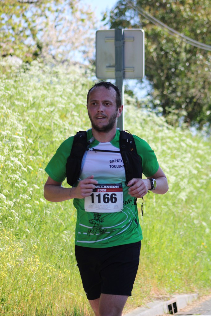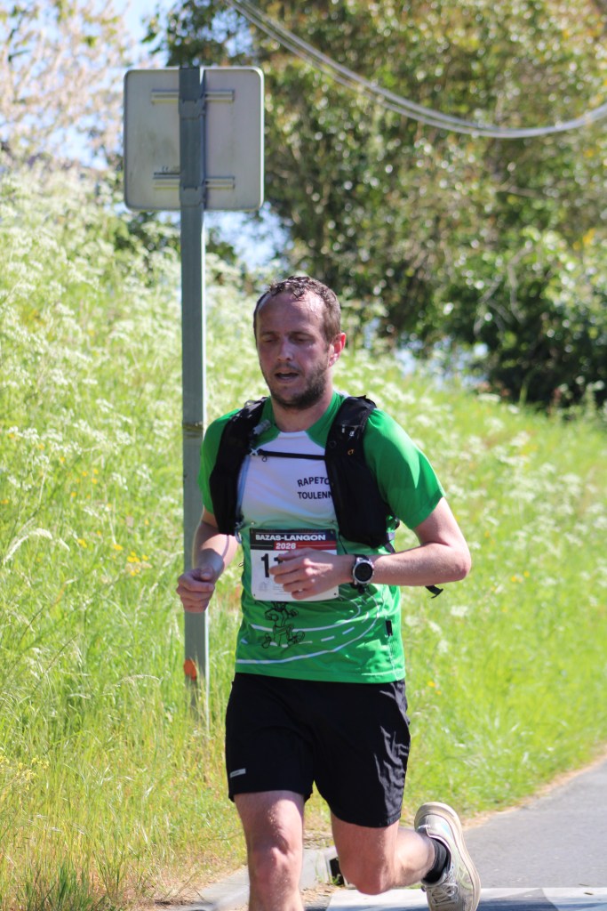 De ma vie, je n’ai jamais autant subi une course qui n’est pas un marathon. Impossible d’accélérer dans les descentes. Impossible de rester stable dans les côtes. Impossible de ne pas m’arrêter aux ravitos. J’ai chaud. Le soleil cogne. Je me verse des gobelets sur la gueule pour me rafraîchir, pour me réveiller… Rien n’y fait. Et pourtant, je suis encouragé. Ça gueule mon nom tout au long du parcours. Camille et Loulou à Cazats. Ma sœur Laure, avec mon père et Véro, qui m’attendent aussi à Cazats avec des pancartes, puis à Coimères et à quelques pas de la ligne d’arrivée. Aubin et sa mère sont là aussi. Aubin a fait le kilomètre des Vergers pendant que j’étais sur le parcours.