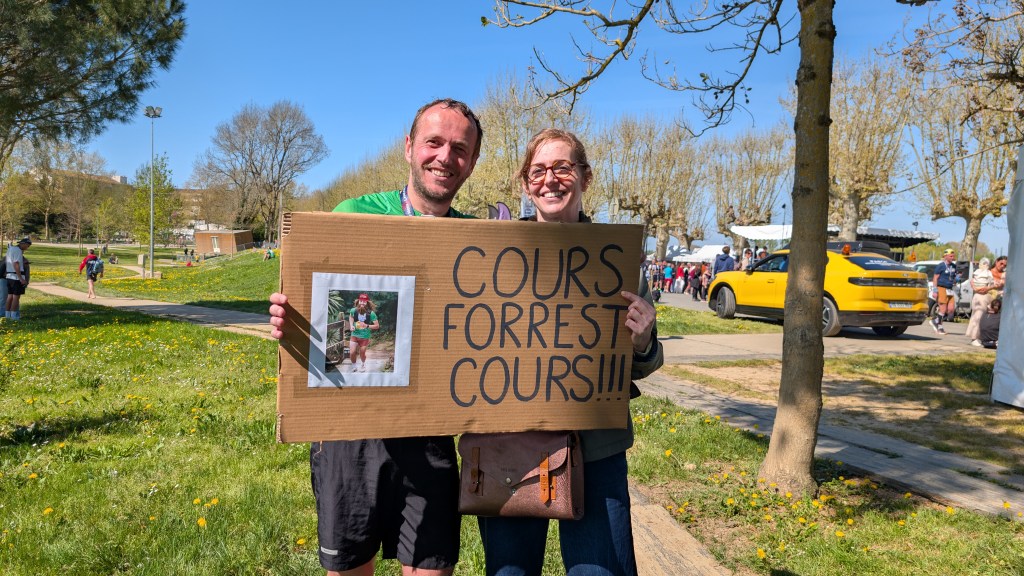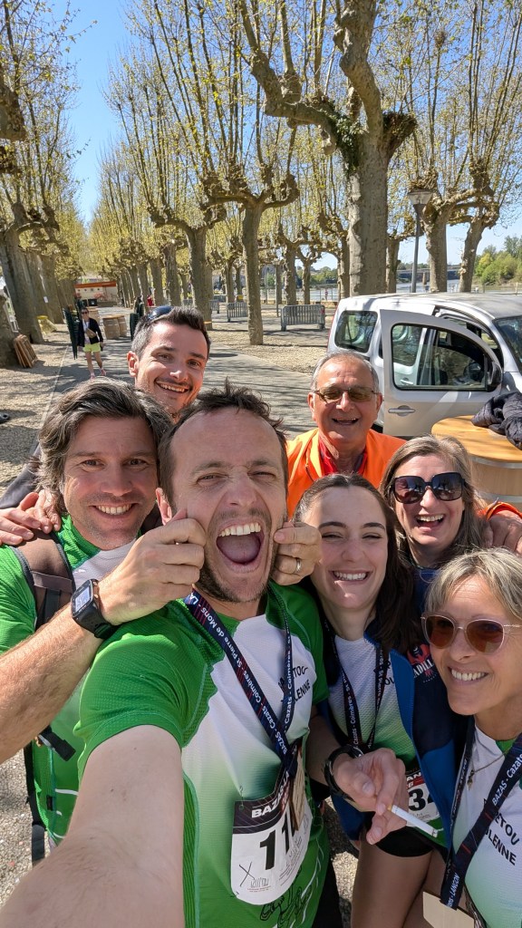 Je reprends mes esprits. J’embrasse Aubin et le félicite. Je discute avec ma famille… Je lâche quelques rires en découvrant les pancartes que ma sœur a concoctées. Ça fait du bien. Mais c’est l’heure pour moi de me retirer, d’aller boire une bière et de rentrer m’enfermer chez moi. Je retrouve Thomas et Samuel, qui n’est pas content de son résultat non plus. Damien, lui, est en 1h31. Aurélien a fini en 1h25. Et moi ? Ben moi, je boucle la course en 1h42min45s. Soit mon pire temps sur un Bazas-Langon. Rien que ça. Remarquez, d’une certaine façon, on peut appeler ça un record.